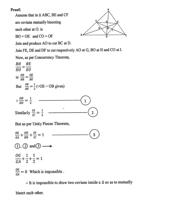Prove that no two cevians drawn inside a triangle bisect each other.
